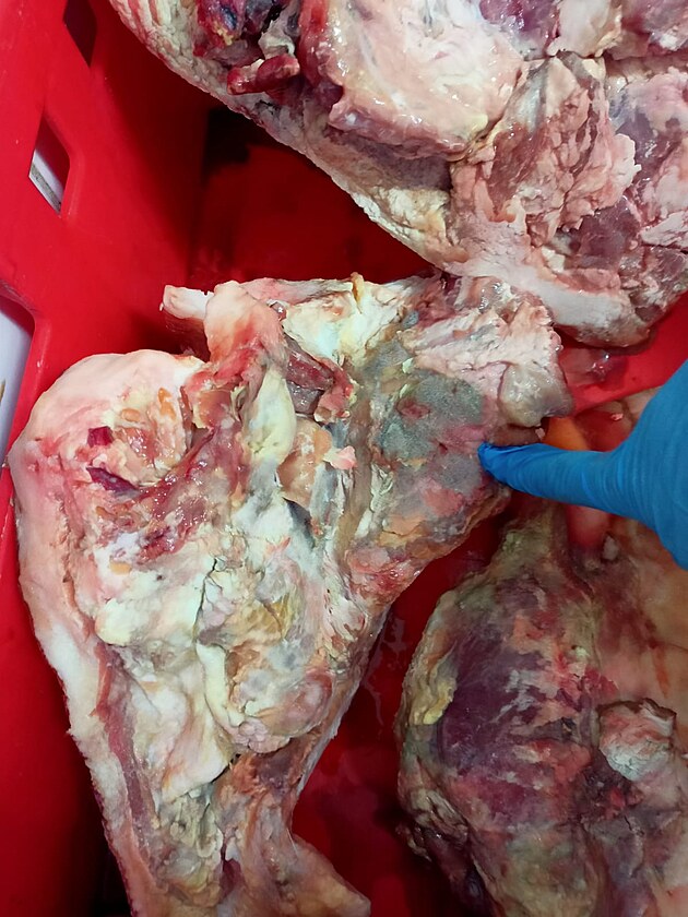 Naprosto viditelně zkažené maso. Zeleně na něm „kvete“ plíseň.