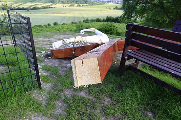Zničená socha Óda na Frankovku nedaleko Velkých Pavlovic. Znázorňovala Ježíše s pohárkem vína. (17. června 2025)