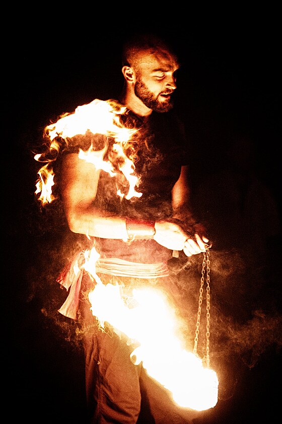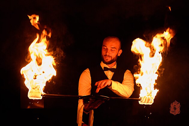 Třicetiletý Ondřej Minář se už dekádu věnuje hrátkám s ohněm, k žonglování přidává i příběh. Na snímku vystupuje jako číšník.