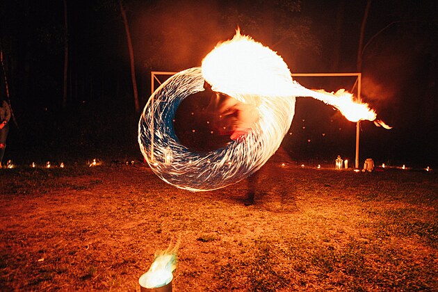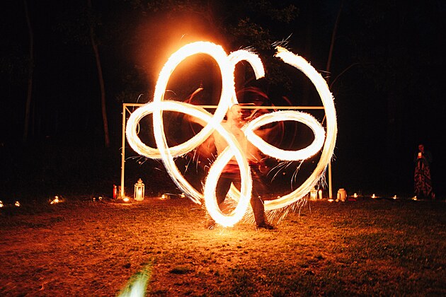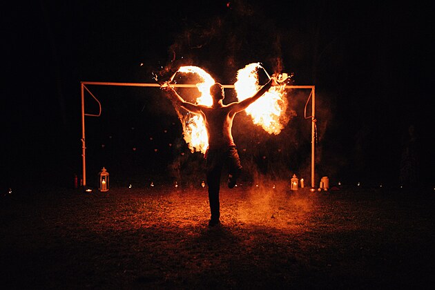 Třicetiletý Ondřej Minář se už dekádu věnuje hrátkám s ohněm, k žonglování přidává i příběh. Na snímku vystoupení v duchu Harryho Pottera.