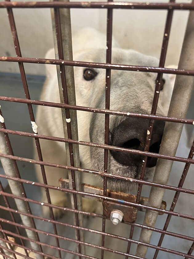 Jedna ze dvou ledních medvědic v zázemí brněnské zoo, kam v pátek ráno přicestovaly z Německa. (18. července 2025)