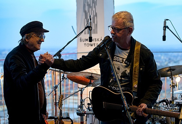 Společně vystoupili na koncertě právě v Brně letos v dubnu. Vybrali si předposlední patro opravované výškové budovy v Šumavské ulici.