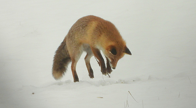 Liška vyskočí vysoko a pak se zaryje čumákem do sněhu