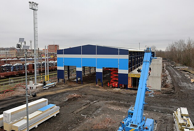 Zbrusu nová opravárenská hala roste v areálu nádraží v Chebu. (16. ledna 2025)