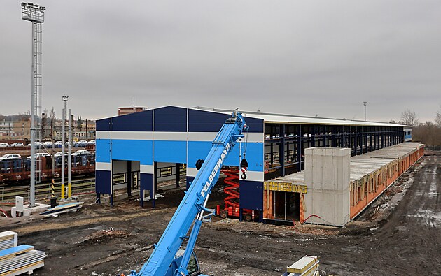 Zbrusu nová opravárenská hala roste v areálu nádraží v Chebu. (16. ledna 2025)
