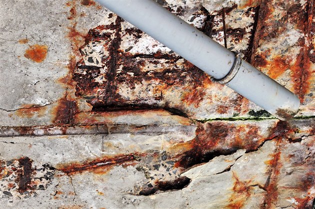 Detail poškozené římsy Chebského mostu přes řeku Ohři v Karlových Varech