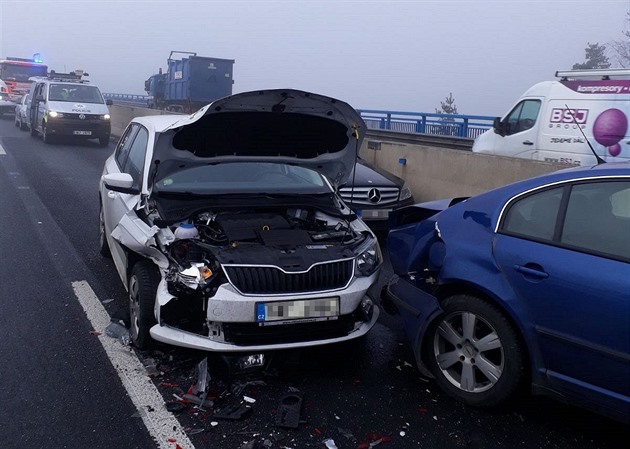 Podle krajské policejní mluvčí Zuzany Týřové se v úseku stala hromadná dopravní nehoda. První automobil narazil do svodidel, ostatních devět pak na ledovce nestihlo včas dobrzdit.