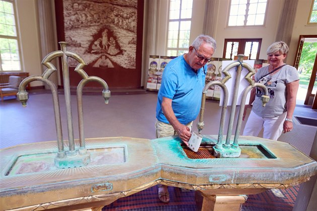 Do Františkových Lázní se vracejí lázeňští hosté. Dvorana Glauberových pramenů.