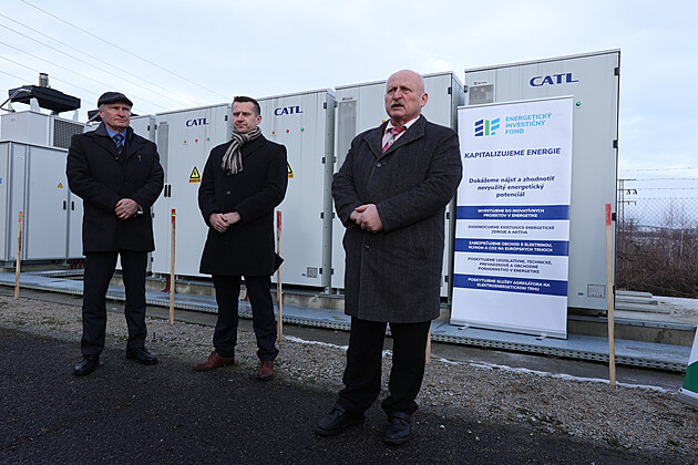 Jiří Pöpperl (vpravo) při otevření bateriového úložiště u Královského Poříčí