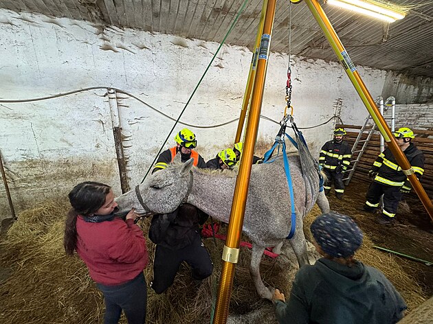 Postavit koně zpět na nohy ve stáji v Krásné u Kraslic na Sokolovsku trvalo hasičům přibližně tři hodiny. (27. října 2024)