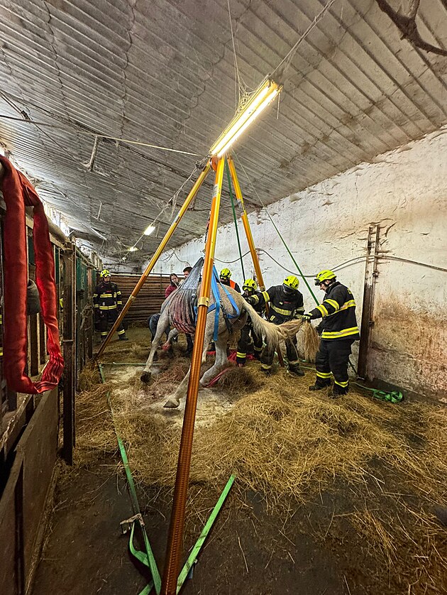 Postavit koně zpět na nohy ve stáji v Krásné u Kraslic na Sokolovsku trvalo hasičům přibližně tři hodiny. (27. října 2024)