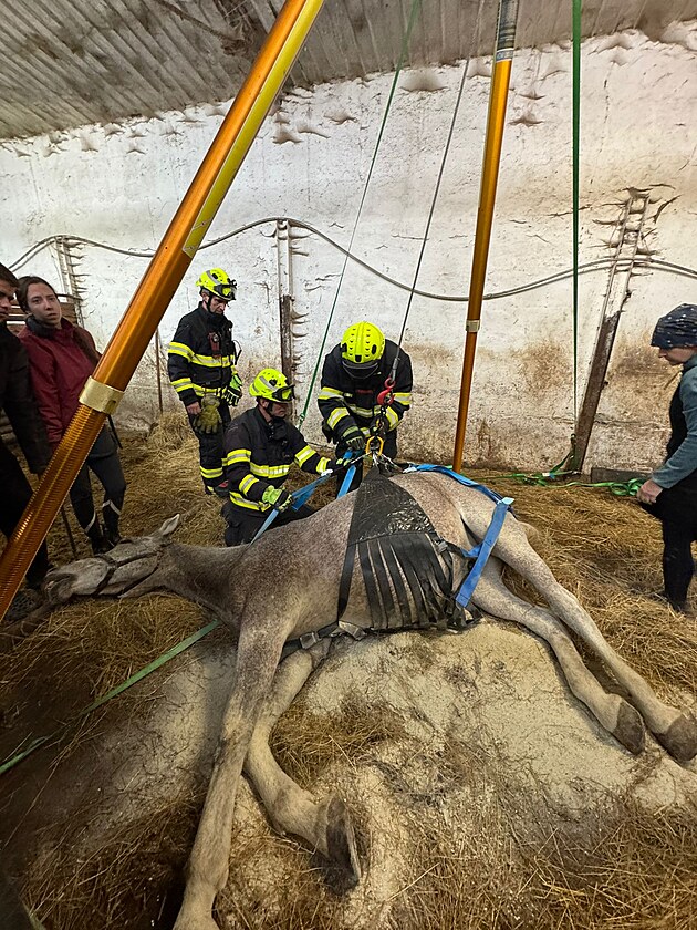 Postavit koně zpět na nohy ve stáji v Krásné u Kraslic na Sokolovsku trvalo hasičům přibližně tři hodiny. (27. října 2024)