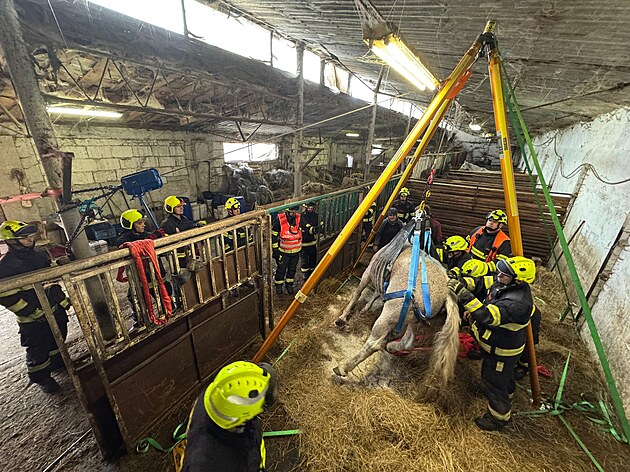Postavit koně zpět na nohy ve stáji v Krásné u Kraslic na Sokolovsku trvalo hasičům přibližně tři hodiny. (27. října 2024)