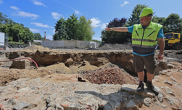 Archeolog Muzea Cheb Michal Beránek ukazuje zbytky opevnění, které objevili stavbaři při rekonstrukci Kamenné ulice.