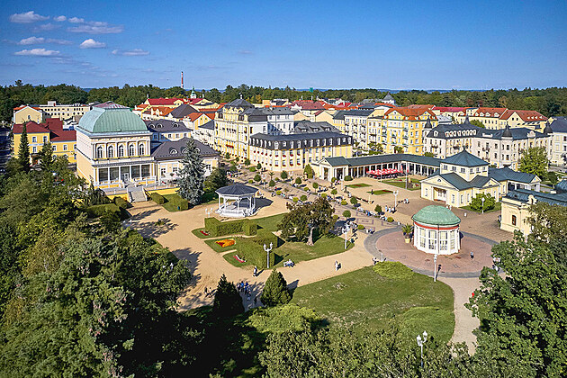 Letecký pohled na lázeňské centrum s Františkovým pramenem, Uhličitými plynovými lázněmi a Společenským domem
