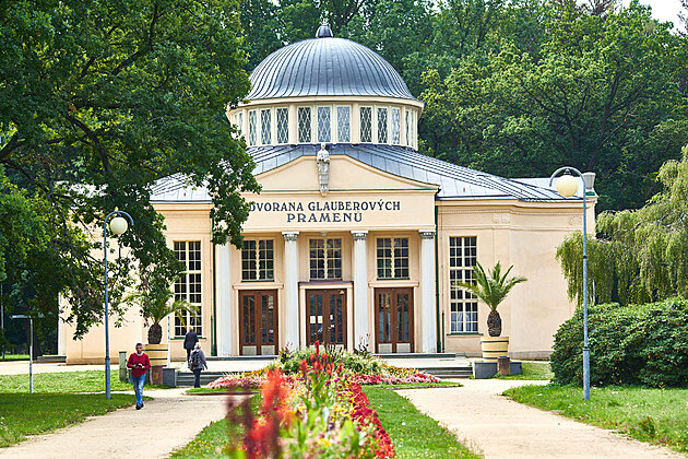 Tři významné prameny Františkových Lázní – Kostelní, Glauber III a Glauber IV zastřešuje Dvorana Glauberových pramenů.