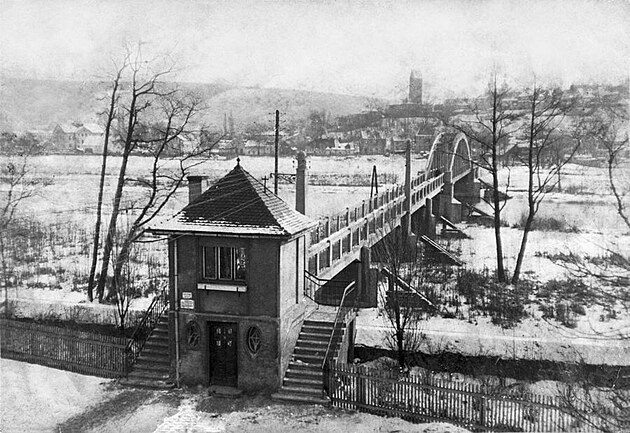 Dřevěná lávka pro pěší v Kynšperku nad Ohří (cca 1925). Foto: archív Jiřího Linharta