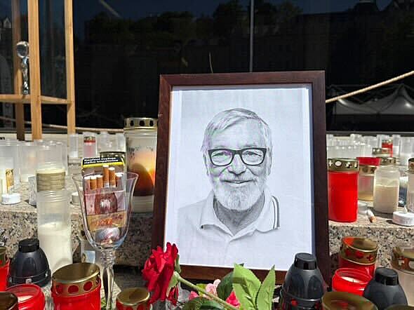 Před hotelem Thermal, který je tradičně symbolickým centrem filmového festivalu v Karlových Varech, vyrostlo pietní místo na počest Jiřího Bartošky. (10. května 2025)