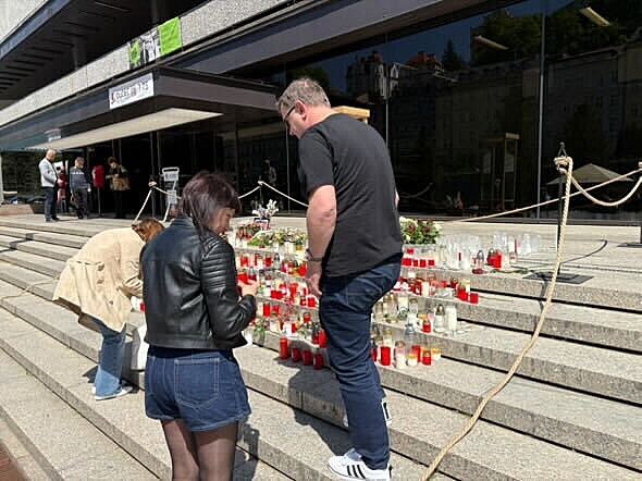 Před hotelem Thermal, který je tradičně symbolickým centrem filmového festivalu v Karlových Varech, vyrostlo pietní místo na počest Jiřího Bartošky. (10. května 2025)