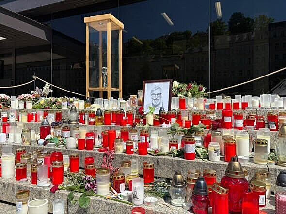 Před hotelem Thermal, který je tradičně symbolickým centrem filmového festivalu v Karlových Varech, vyrostlo pietní místo na počest Jiřího Bartošky. (10. května 2025)