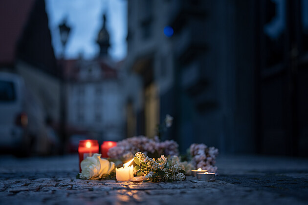 Lidé zapalují svíčky za zemřelého herce Jiřího Bartošku před jeho domem. (8. května 2025)