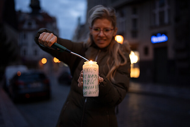 Lidé zapalují svíčky za zemřelého herce Jiřího Bartošku před jeho domem. (8. května 2025)
