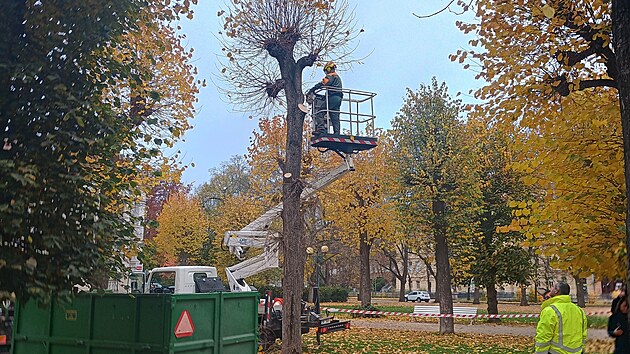 Stav lípy srdčité ve Smetanových sadech byl havarijní, v úterý ji proto správci zeleně pokáceli. (29. října 2024)