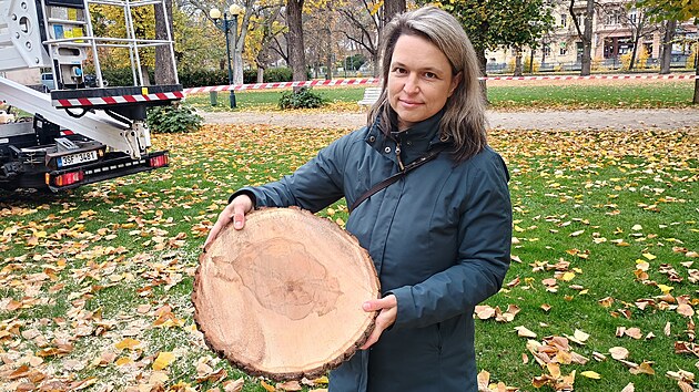 Stav lípy srdčité ve Smetanových sadech byl havarijní, v úterý ji proto správci zeleně pokáceli. (29. října 2024)