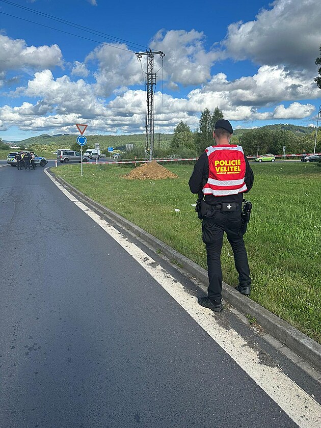 Policisté zasahují u nálezu protitankové miny u hypermarketu Globus v Jenišově. (22. července 2025)