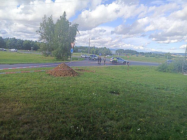 Policisté zasahují u nálezu protitankové miny u hypermarketu Globus v Jenišově. (22. července 2025)
