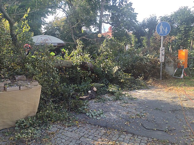Strom spadl na hlavní třídě Karlových Varů na prodejní stánky, zranil ženu.