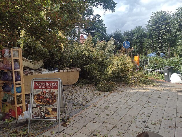 Strom spadl na hlavní třídě Karlových Varů na prodejní stánky, zranil ženu.