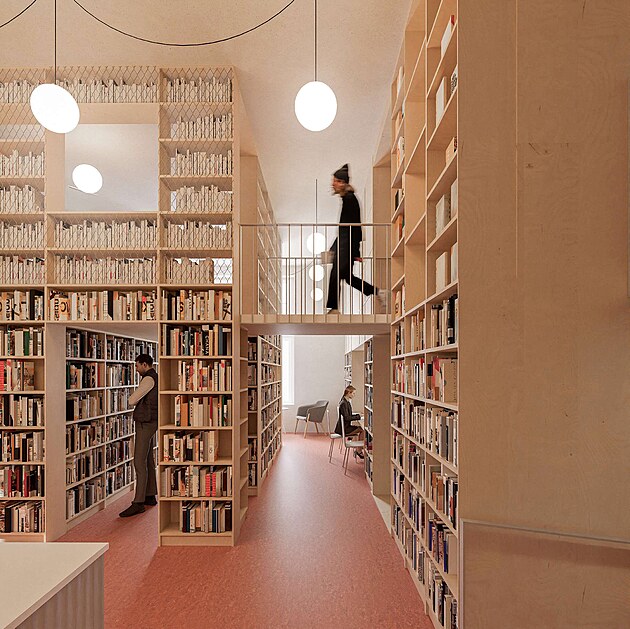 Vizualizace budoucí podoby interiérů chebské knihovny po rekonstrukci. Autorem návrhu je architektonický ateliér A69 architekti.