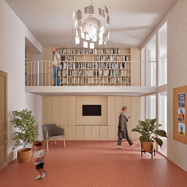 Vizualizace budoucí podoby interiérů chebské knihovny po rekonstrukci. Autorem návrhu je architektonický ateliér A69 architekti.