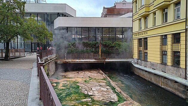 Provizorní Krasavec ve zmenšené podobě stojí nad korytem řeky Teplá nedaleko vývěru Vřídla.