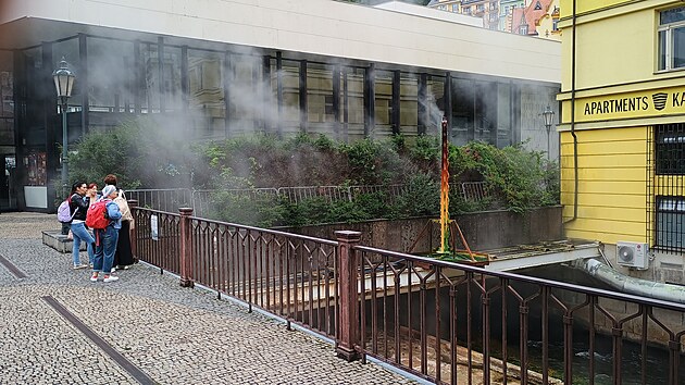 Provizorní Krasavec ve zmenšené podobě stojí nad korytem řeky Teplá nedaleko vývěru Vřídla.