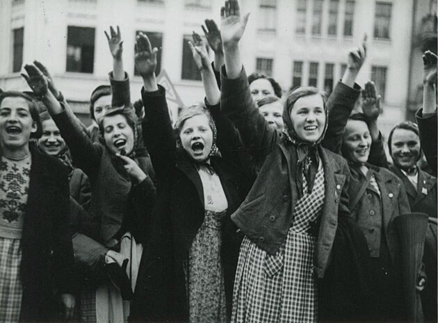 Karlovarští Němci vítají vojáky wehrmachtu.