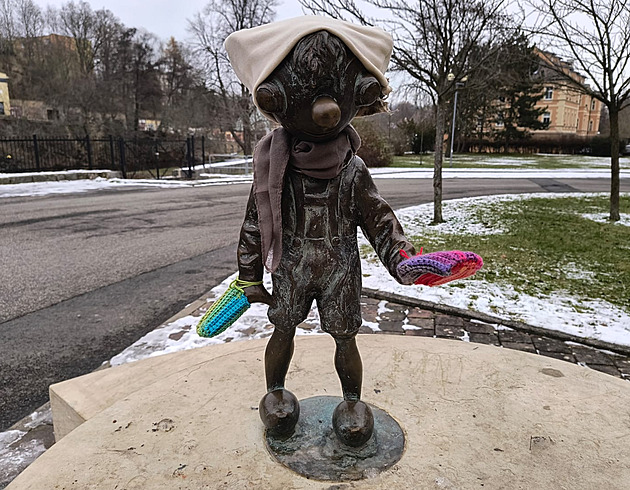 Móda oblékání soch pokračuje. Po Františkovi se do zimního oblékl i Hurvínek![]() |