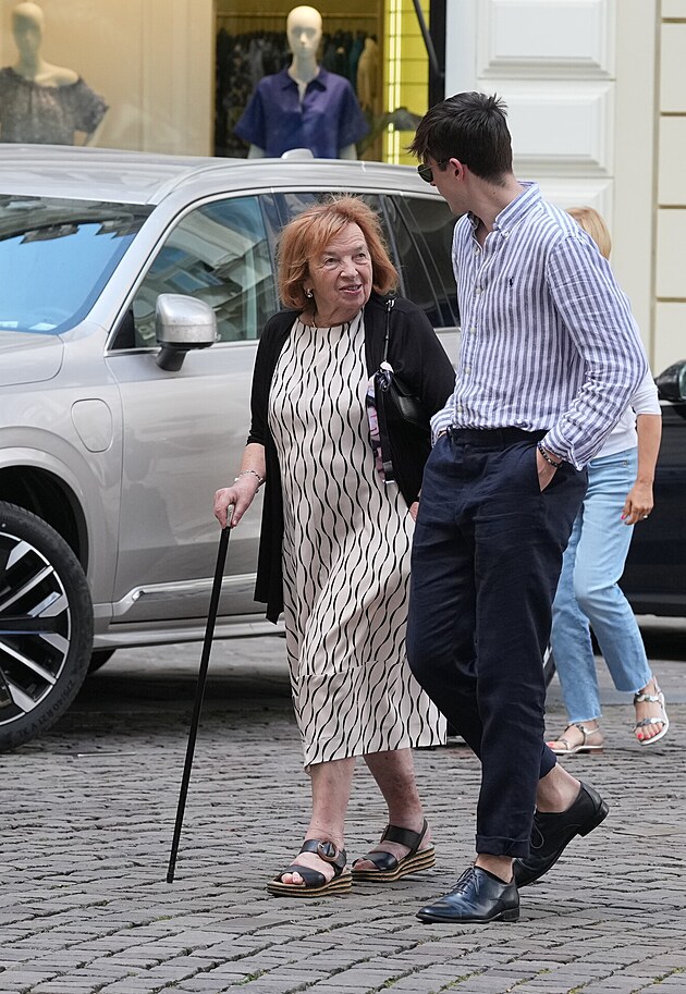 Livia Klausová dorazila ve svém typickém stylu. K Puppu ji doprovází vnuk v proužkované košili.