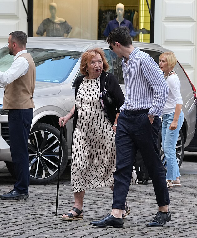 Livia Klausová dorazila ve svém typickém stylu. K Puppu ji doprovází vnuk v proužkované košili.