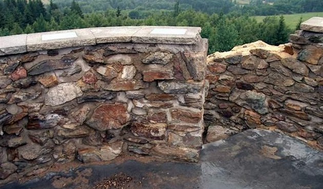 Na kamenném zábradlí rozhledny Krásenského vrchu jsou informační tabulky s okolními kopci.