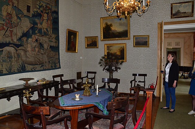 Interiér zámku Kynžvart. Upravený kuřácký salonek.