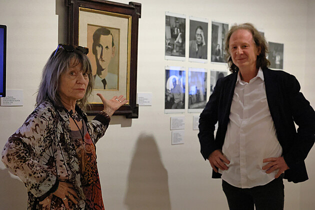 Blanka Chocholová jejíž otec Václav Chochola Františka Tichého fotografoval, se ředitelem GaVU Marcelem Fišerem u portrétu svého otce od FrantiškaTichého.