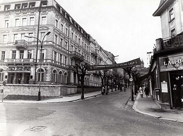 Hotel Kriváň a Sadová ulice v Karlových Varech v 80. letech 20. století.