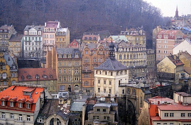 Zámecký vrch v Karlových Varech ze stezky Jeana de Carro v roce 1989.