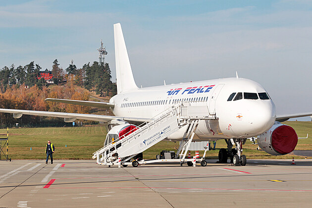 Dopravní letadlo Airbus na ploše karlovarského letiště, kde prochází údržbou. Mezinárodní letiště Karlovy Vary totiž v roce 2021 zahájilo spolupráci se společností AviTechnics v segmentu údržby dopravních letadel. (25.října 2021)
