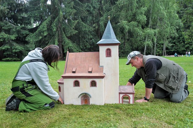 Kostelík z Hrusic v mariánskolázeňském miniaturparku Boheminium