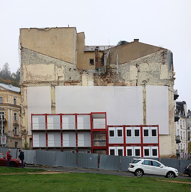 Pozůstatek vyhořelého hotelu Rozkvět na Mírovém náměstí v Mariánských Lázních. (18. října 2024)