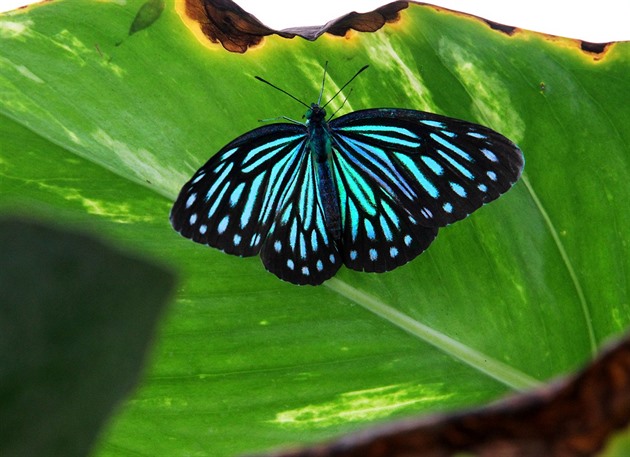Modře zbarvení motýli patří podle Kučery u návštěvníků mezi nejoblíbenější. Většina z nich ani nemá české jméno. To je i příklad motýl latinsky pojmenovaného Morpho peleides.