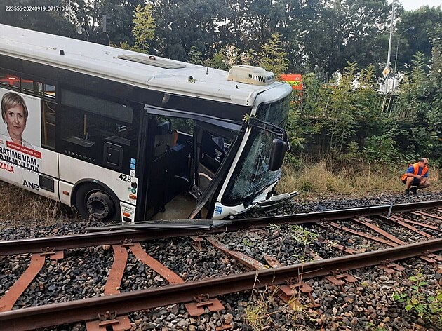 Po střetu s osobním vozidlem skončil autobus v kolejišti. (19. září 2024)